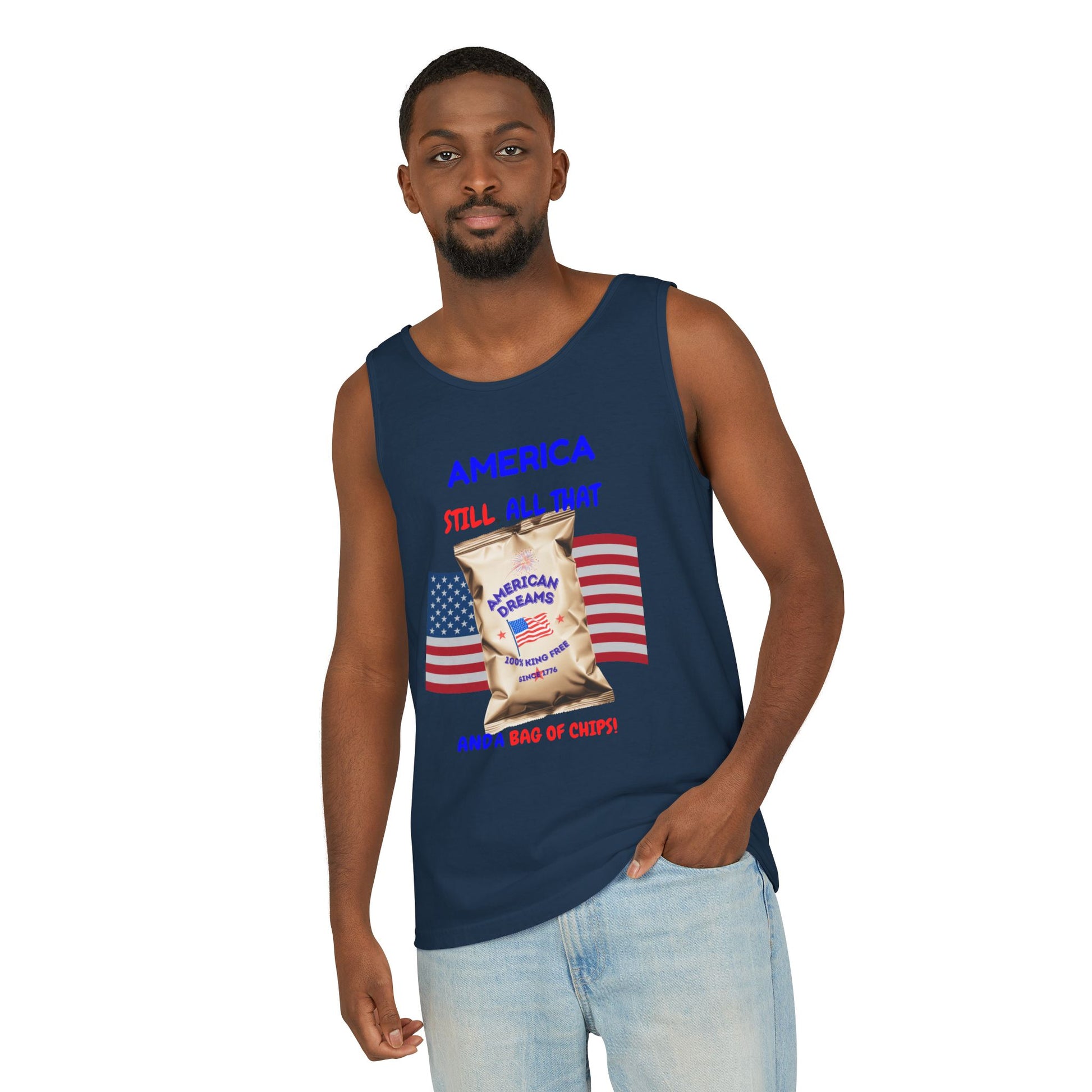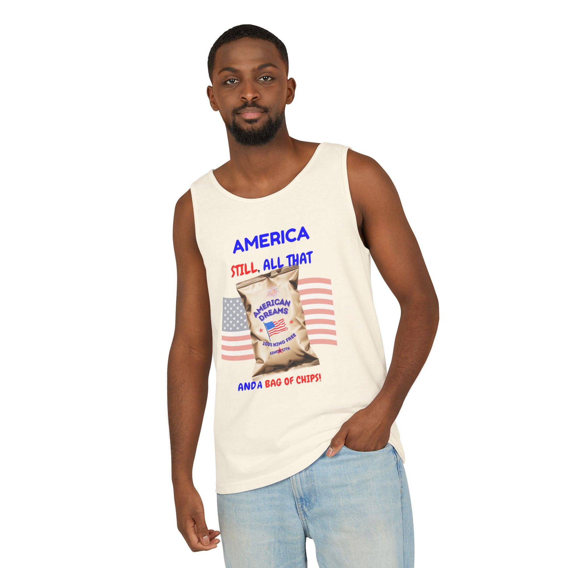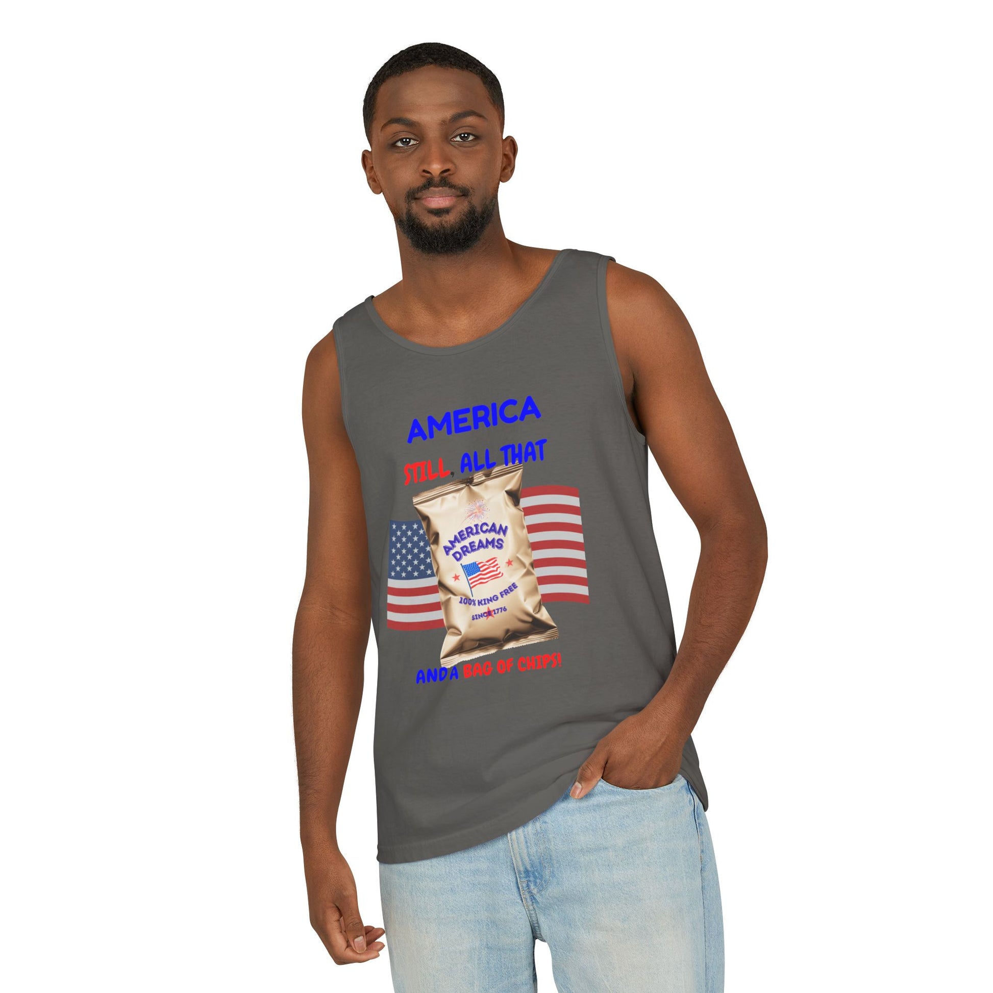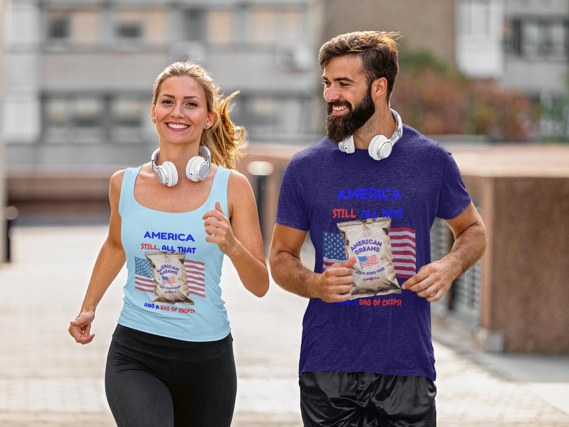Celebrate America with attitude in this cheeky, patriotic tee that blends humor with historical pride. Featuring a stylized American flag backdrop and a bag of “American Dreams” chips front and center, this shirt shouts independence with a wink.