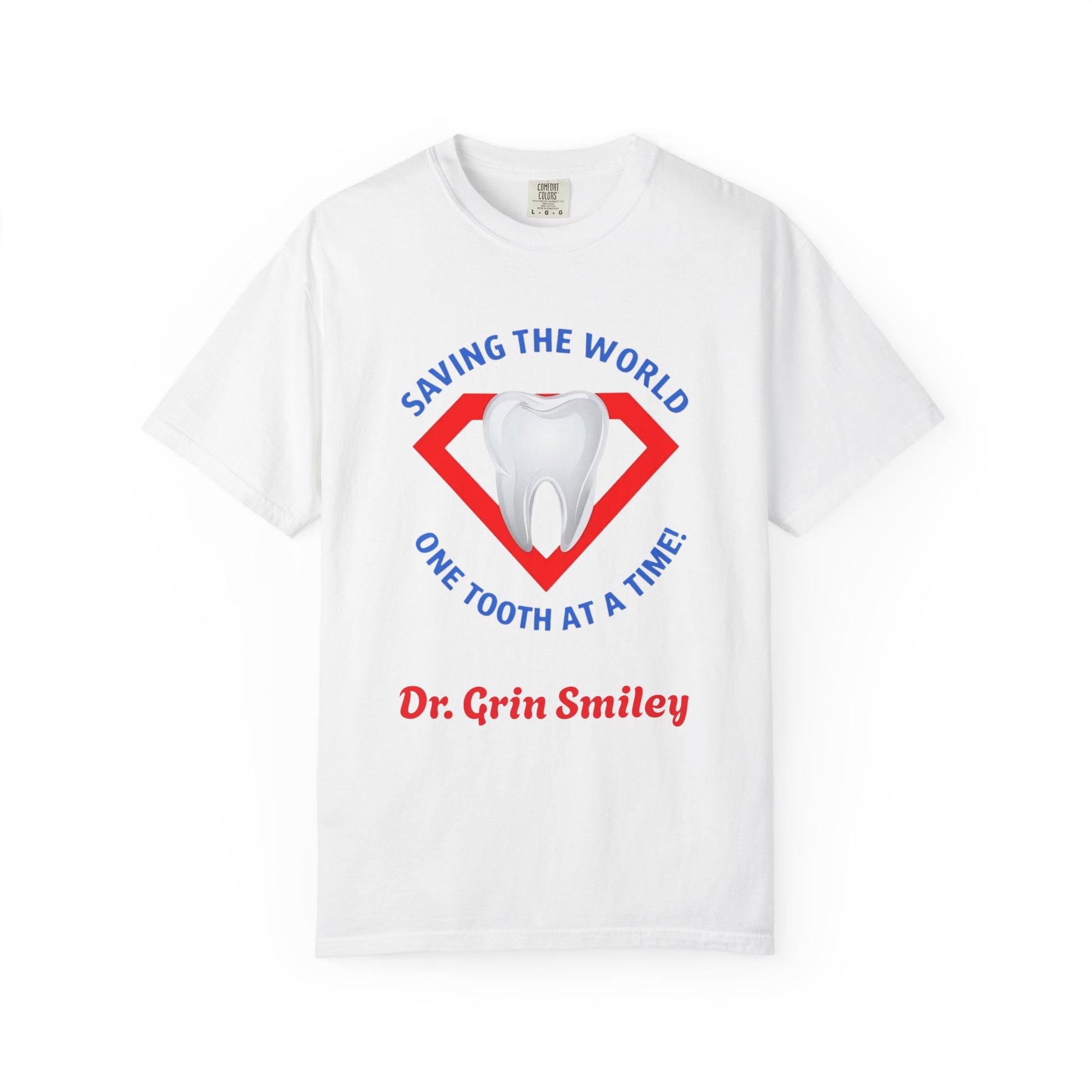 This bold chest emblem says it all: a clean white tooth in a sharp red diamond, ringed by the words “Saving the World One Tooth at a Time.” It’s loud. It’s proud. And it’s made for the real heroes of hygiene.